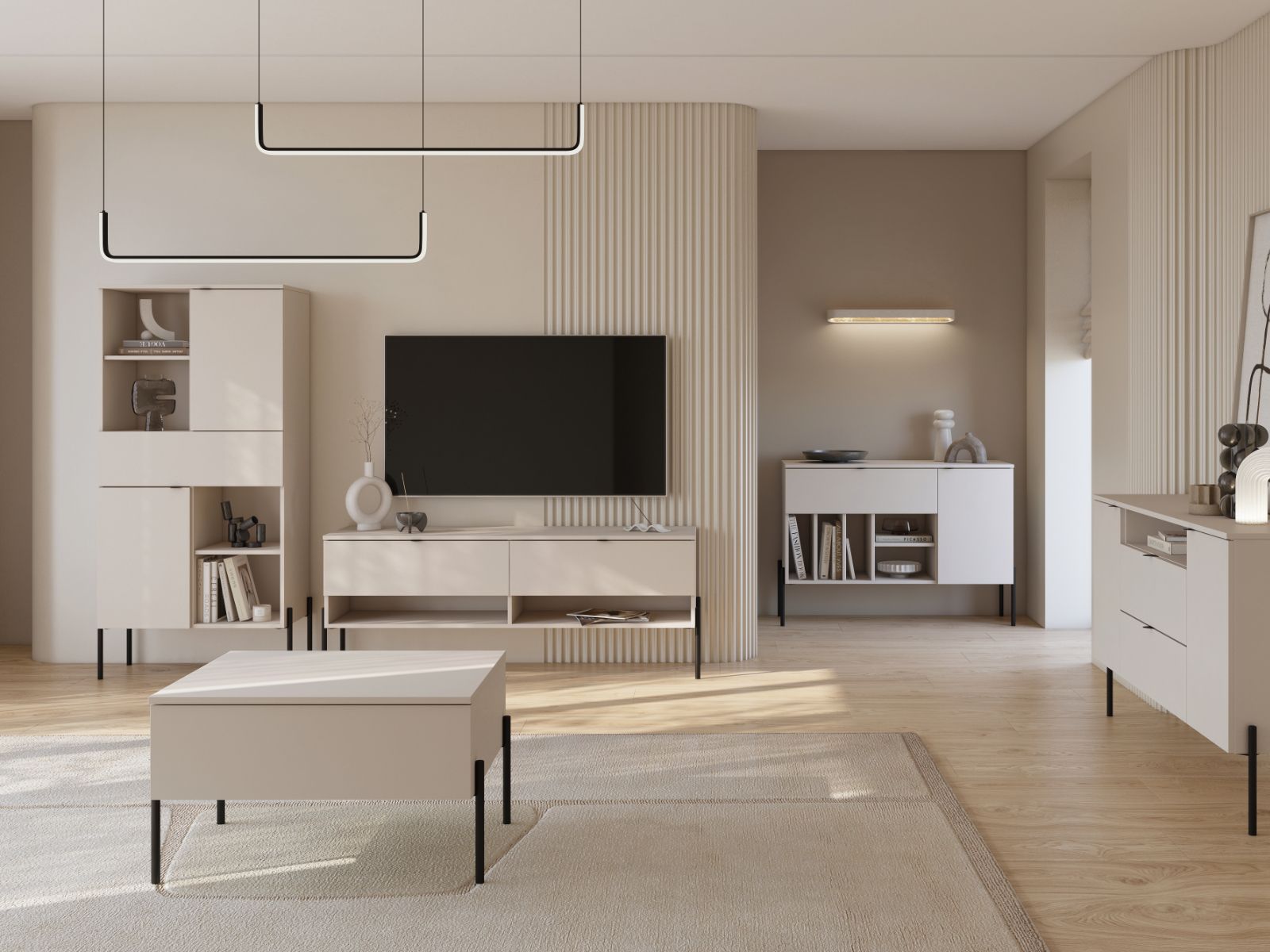 Rechthoekige salontafel ORES combineert modern design met dagelijks gebruiksgemak. De discrete lade biedt ruimte om afstandsbedieningen of kleine spulletjes netjes op te bergen, terwijl het bovenblad perfect is om tijdschriften of decoratieve accessoires altijd binnen handbereik te houden.