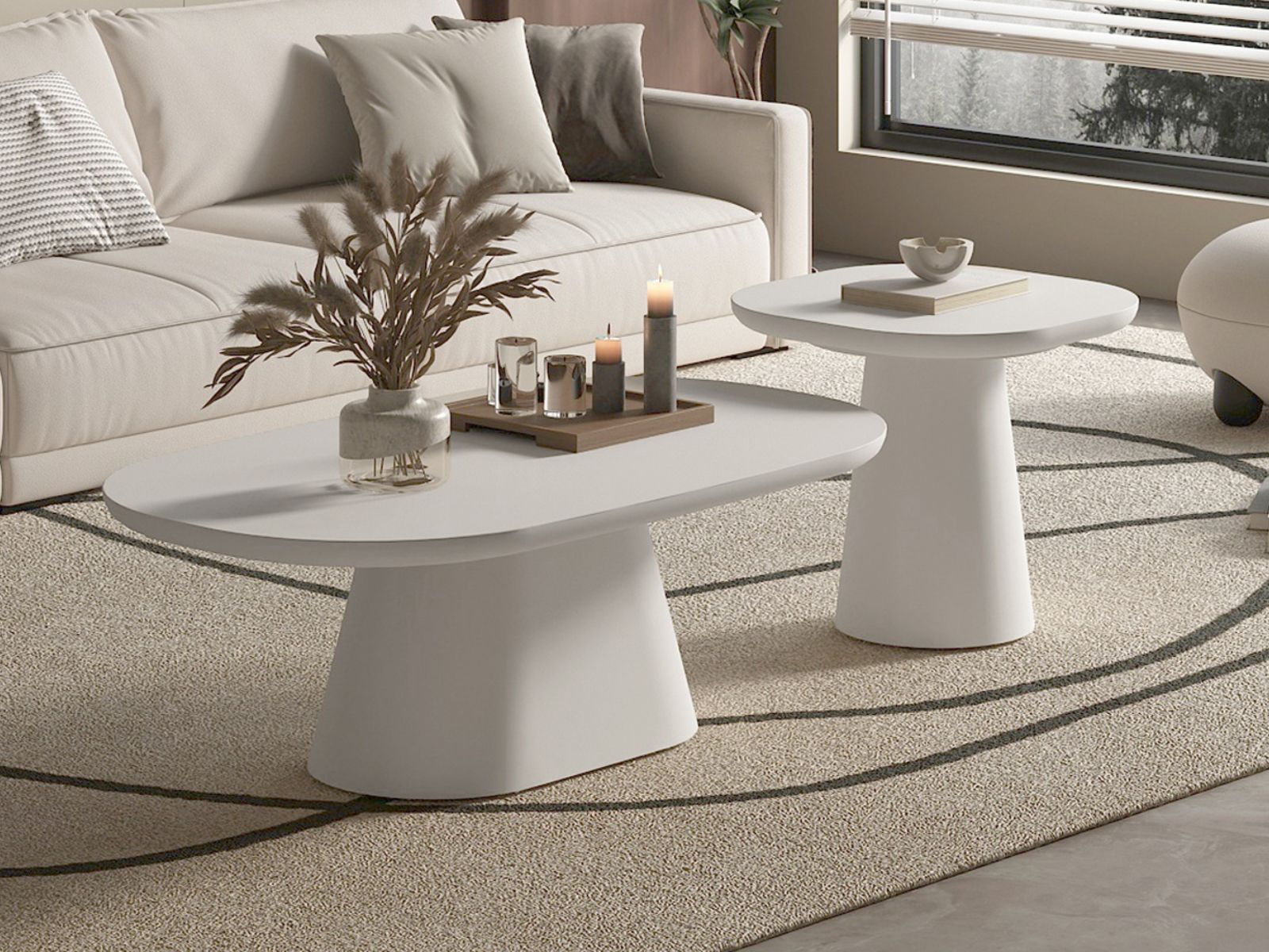 Breng een warme en eigentijdse sfeer in huis met trendy, ronde salontafel TAVIR. Deze salontafel valt op dankzij de originele vormen en de afwerking in cementlook. Het tafelblad en de tafelpoot zijn gemaakt van MDF met een speciale cementverf die het uiterlijk van cementex benadert – voor die stoere, moderne uitstraling, zonder het zware gewicht van echt cement.