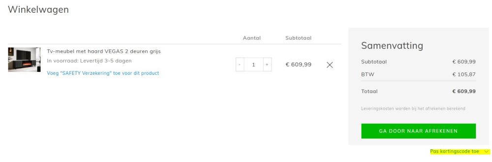 De kortingscode moet worden ingevoerd in het daarvoor bestemde veld tijdens het afronden van je winkelwagentje. Klik hiervoor op het winkelwagentje rechtsboven.